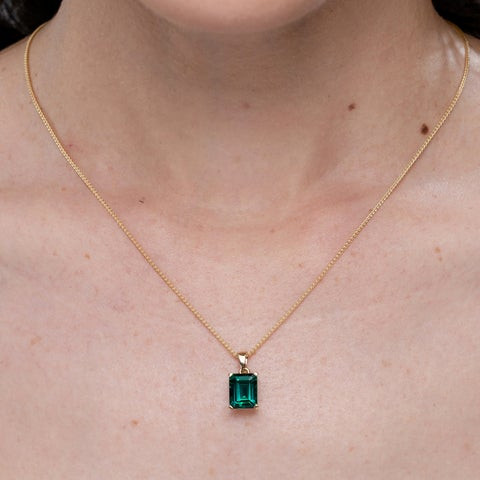 The emerald-cut lab-grown emerald is mounted in a four prong setting and linked to a plain bale.This solitaire pendant is crafted in 14k yellow gold.